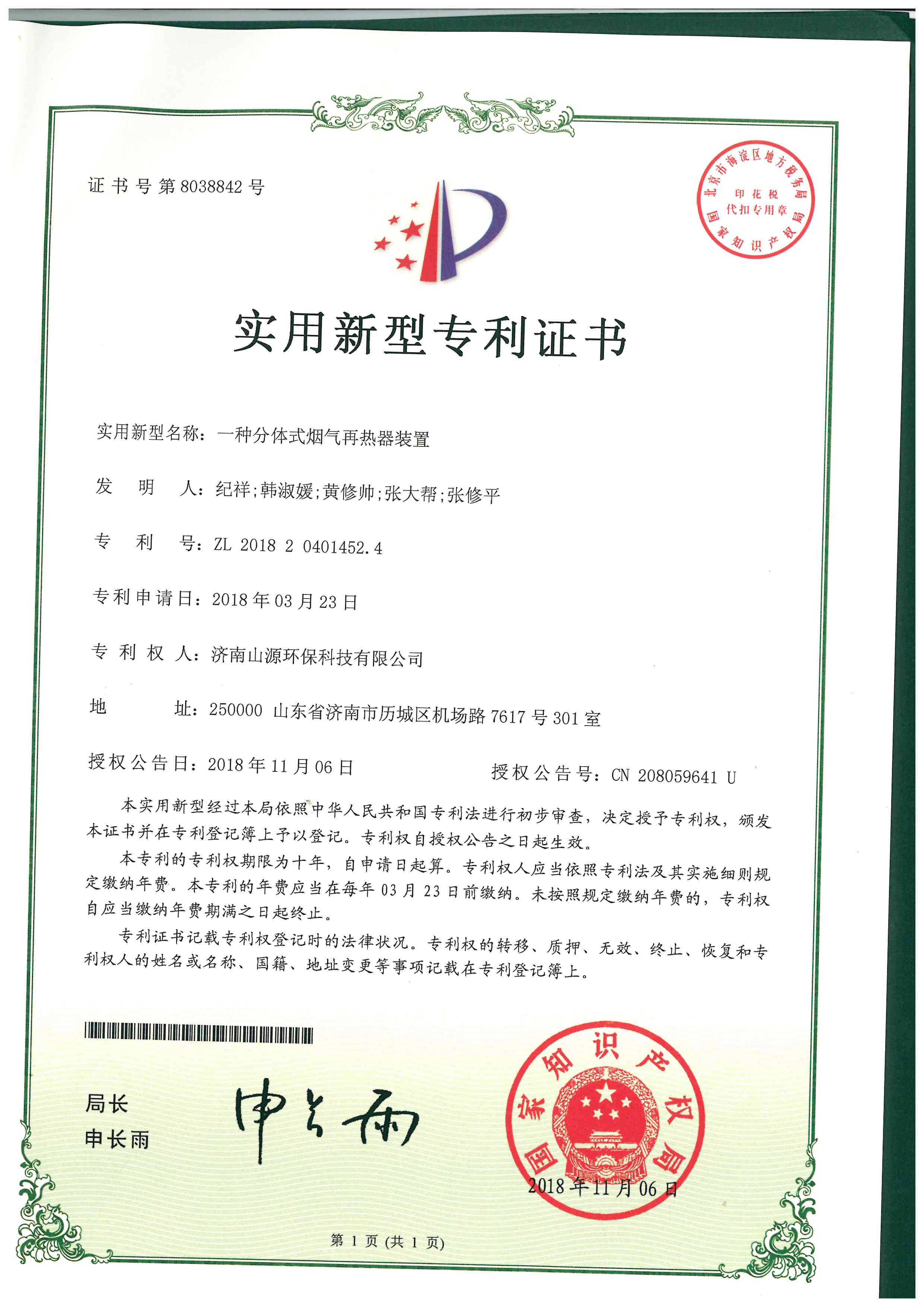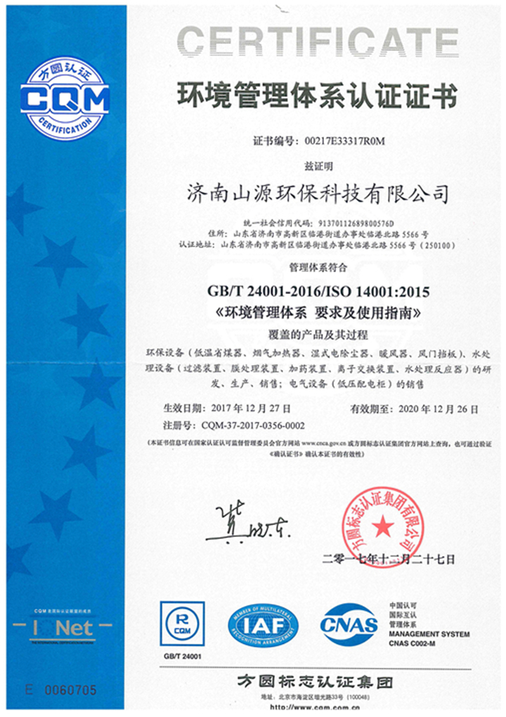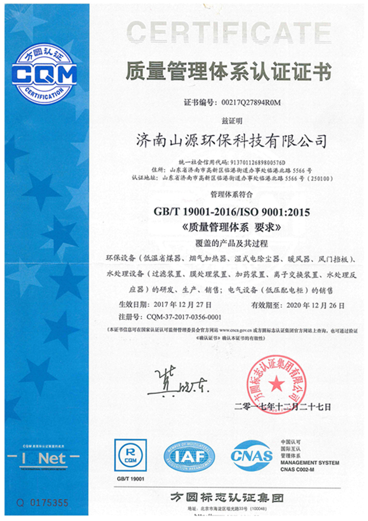 濟南山源環保科技有限公司順利通過ISO9001質量體系認證,環境體系認證,職業健康體系認證等。取得國家多項煙氣余熱、水處理、廢水零排等技術研發專利。憑借專業的技術團隊、強大的制造規模、豐富的工程實戰經驗,公司先后被評為高新技術企業、“守合同重信用企業”、“環境保護產業協會理事單位”,榮獲節能先進企業”、環保行業“突出貢獻企業”等榮譽稱號。公司設有專業技術研發中心,并被認定為濟南市市級“技術中心”,先后與中科院工程熱物理研究所、西安交通大學、上海交通大學、東北電力大學、山東大學等高校合作,共同研究開發國內外節能減排新技術、新裝備,并積極與多家國際公司技術合作不斷引進國外先進技術和設備。
